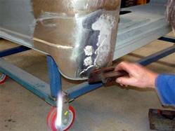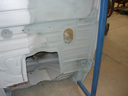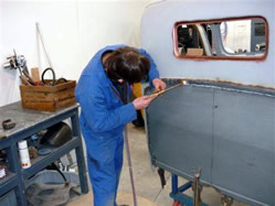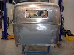 The rear panel was in bad shape with rust and dents, so a new one was made that was fitted, metal finished and leaded. The roof was dented all over, so that was metal finished as well.