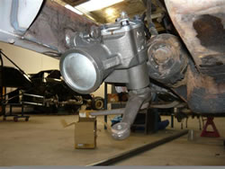 The cab was mounted and door gaps set up with rebuilt hinges and new pins. Steering column fitted and jackshaft to the new box done. Front and rear shocks mounted as well as the exhaust. The front sheet metal is now tidy and fitted – although there is a bit of work still to do here, as I think Rusty has run over a few marker posts in his early days!!