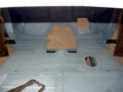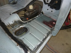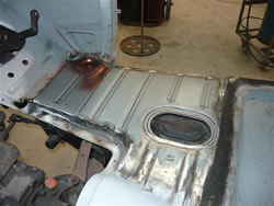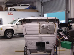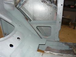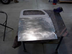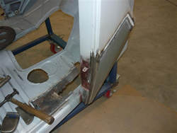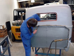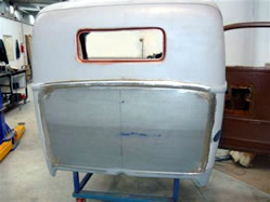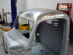 The rear panel was in bad shape with rust and dents, so a new one was made that was fitted, metal finished and leaded. The roof was dented all over, so that was metal finished as well.